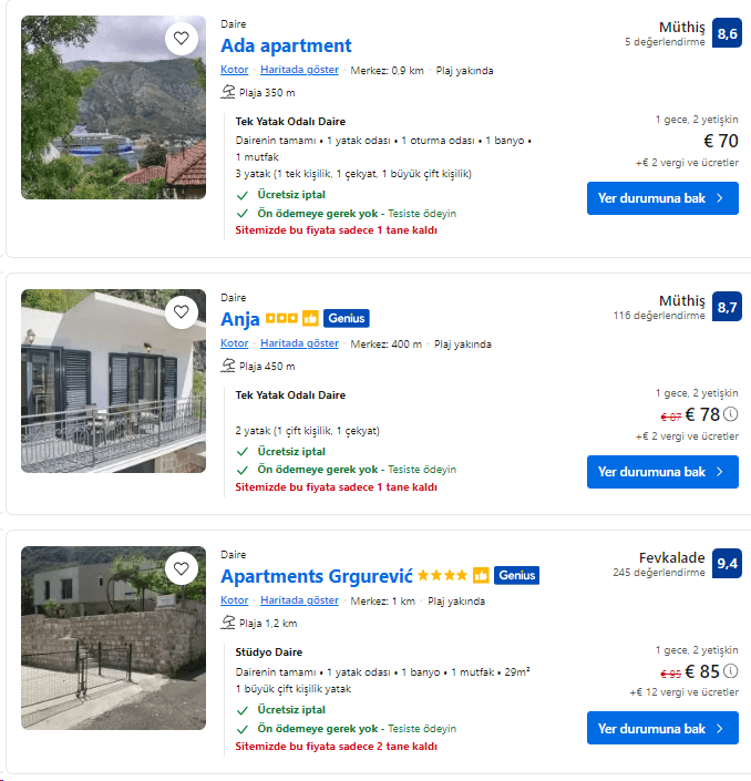 -Gelelim kitabın ortasına 🙂 Yani; fiyatlara. Kotor ve Budva’da modern, merkeze yakın bir daire kiralamak isterseniz bunun gecelik ücreti 70-150 Euro arasında değişiyor.