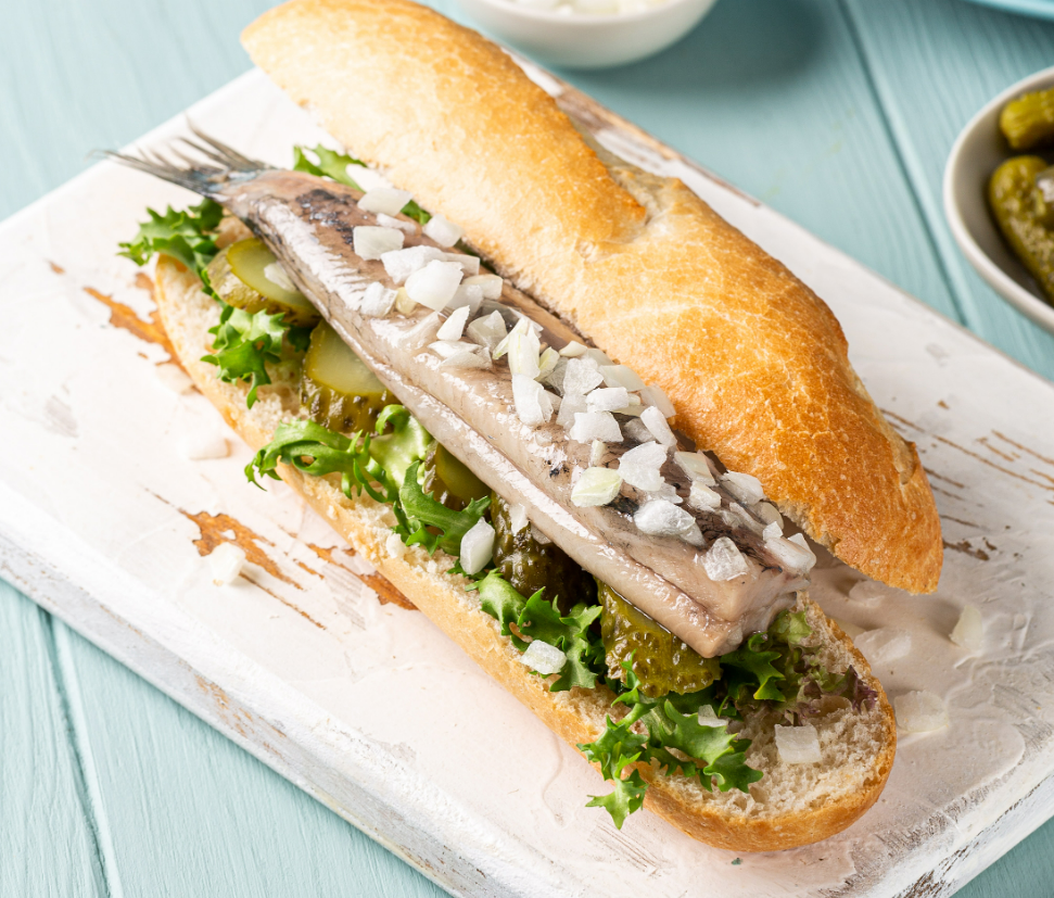 -Herring Sandwich olarak da bilinen Broodje Haring, Ringa Balığı turşusundan yapılan bir sandviç.